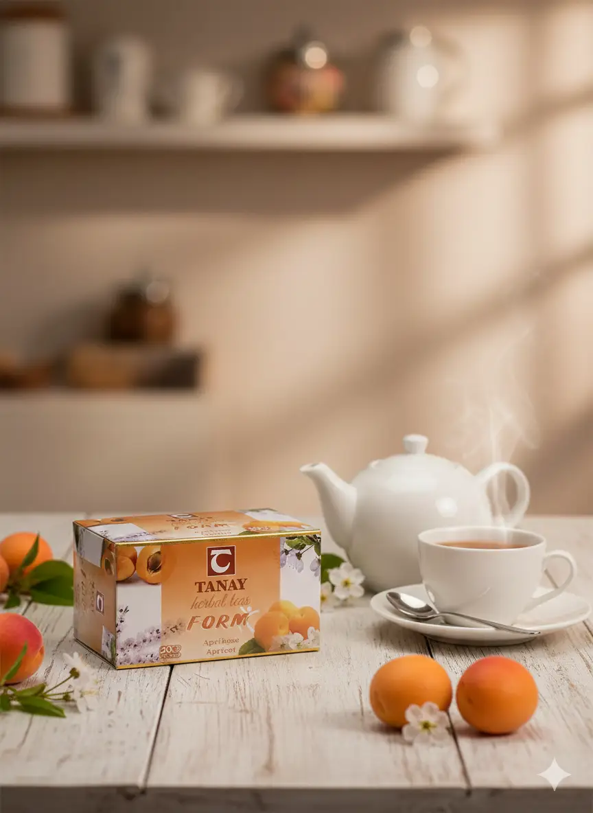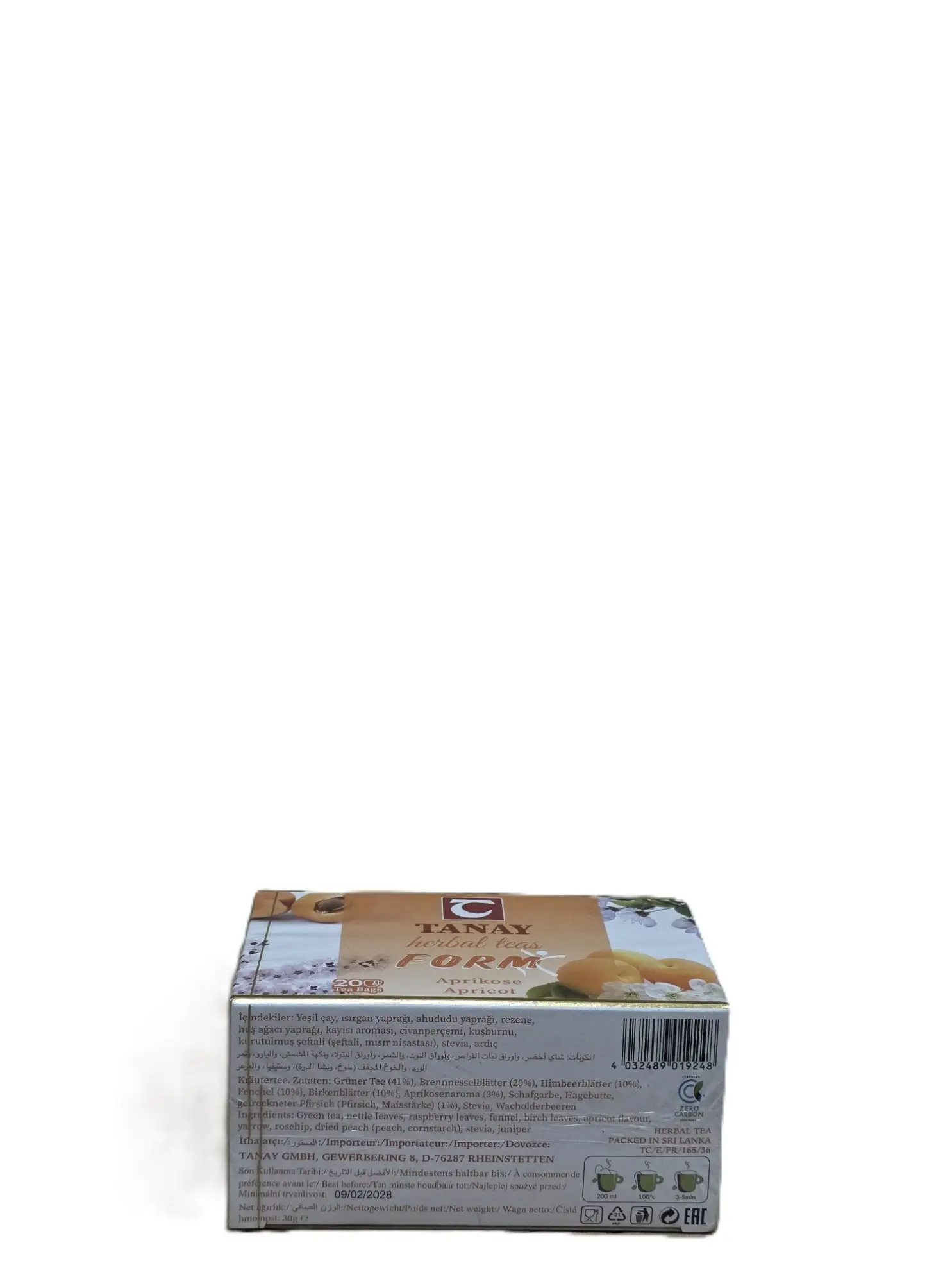 Tanay Form Kräutertee Aprikose 30g – Wohltuender Kräutertee mit Aprikosen-Geschmack. Enthält eine Mischung aus Grüntee, Hagebutte, Hibiskus und Aprikosenaroma.