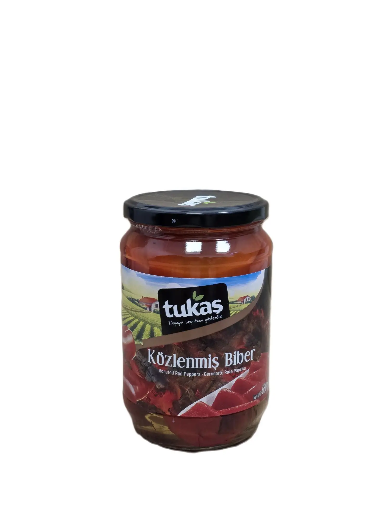 Tukaş Geröstete Rote Paprika – Aromatisch geröstete rote Paprika, verzehrfertig und köstlich zu Fleisch oder Pasta. Nettofüllmenge: 680g, Abtropfgewicht: 400g.