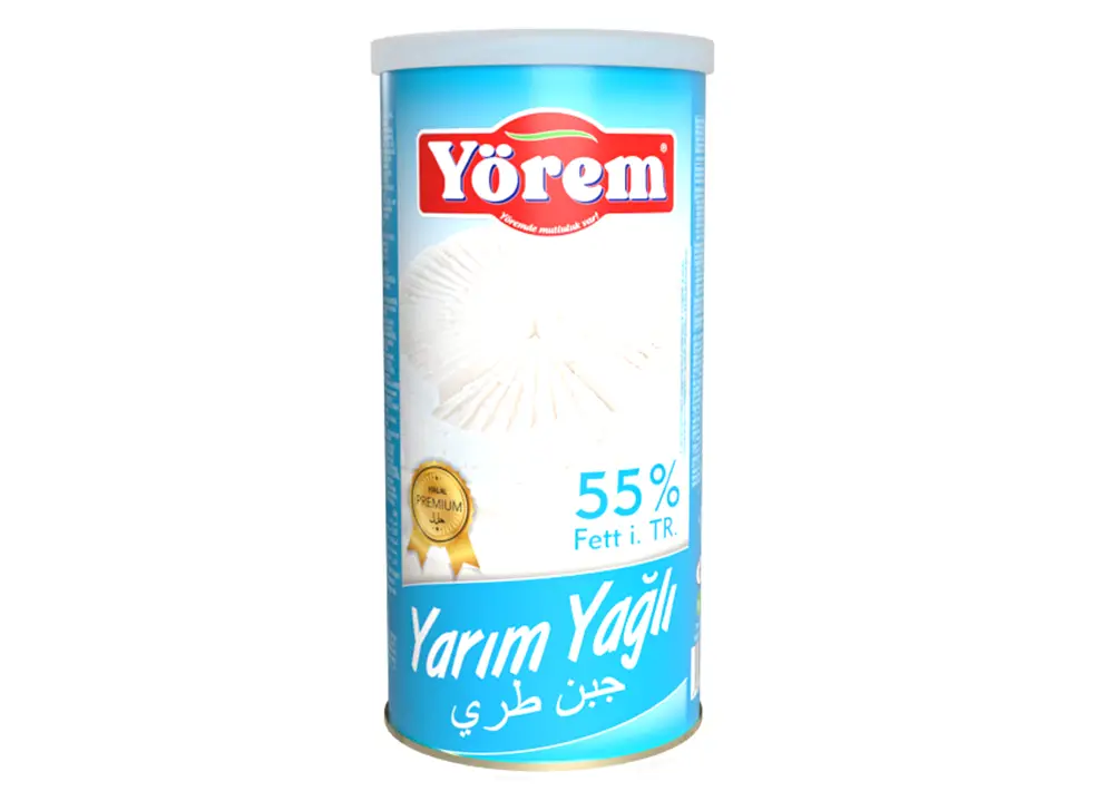 Halal Weißkäse mit 55 % Fett i. Tr. – hergestellt aus pasteurisierter Kuhmilch, bietet dieser Käse eine cremige Textur und einen ausgewogenen Geschmack. In Salzlake haltbar gemacht, ideal für Frühstück, Salate und warme Speisen. Praktische 800g-Dose.