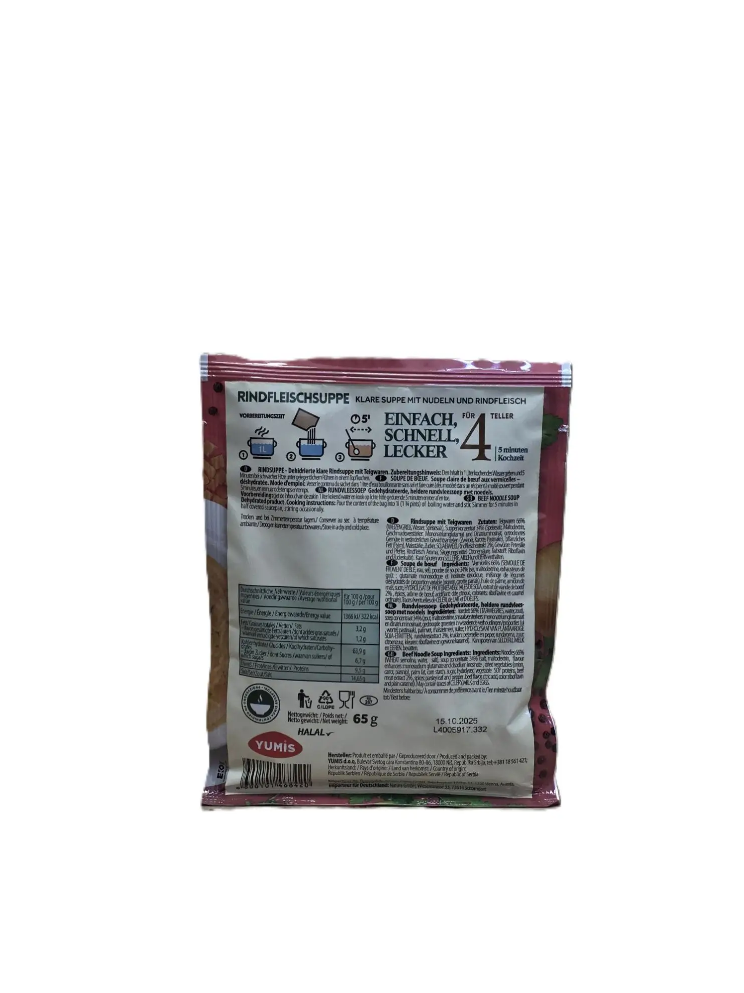 Yumis Rindfleischsuppe – Dehydrierte klare Suppe mit Rindfleisch und Nudeln. Schnell zubereitet in 5 Minuten, ideal für 4 Teller. Inhalt: 65g.
