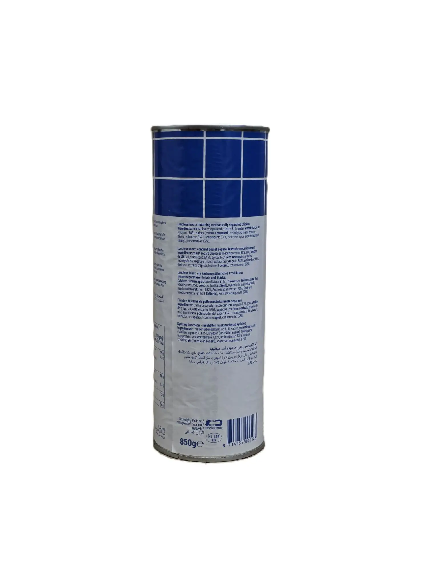 Hühner‑Luncheonfleisch aus mechanisch getrenntem Hühnerfleisch. Milde Variante, verzehrfertig – ideal für Sandwiches und warme Gerichte. Halal gekennzeichnet. Nettofüllmenge: 850 g.